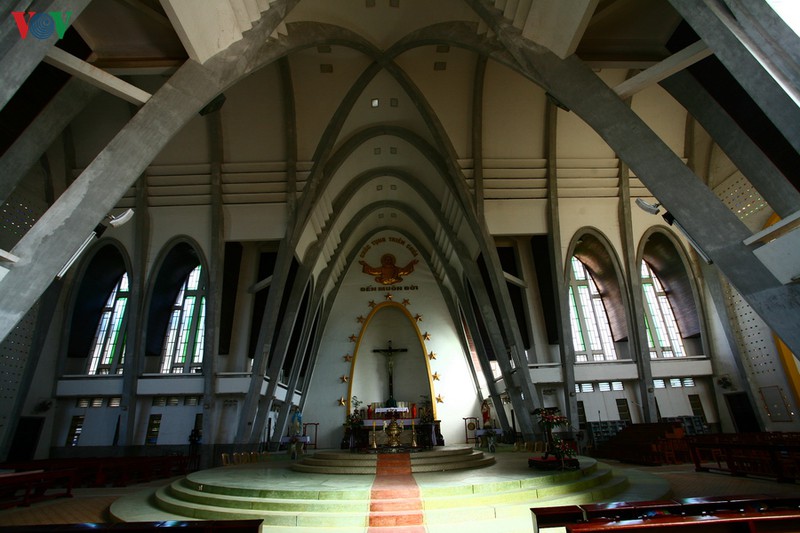 Các trụ đỡ mái thánh đường được bố trí sát chân tường biên, uốn cong vươn lên tạo thành vòm mái công trình, mềm mại như đôi bàn tay chắp lại khi cầu nguyện. Lòng nhà thờ rộng kê những dãy ghế dài có thể chứa được 2.500 người dự lễ. Hai bên tường nhà thờ được trang trí bằng những bức tranh khung gỗ thể hiện về cuộc đời của Chúa Giê – su.