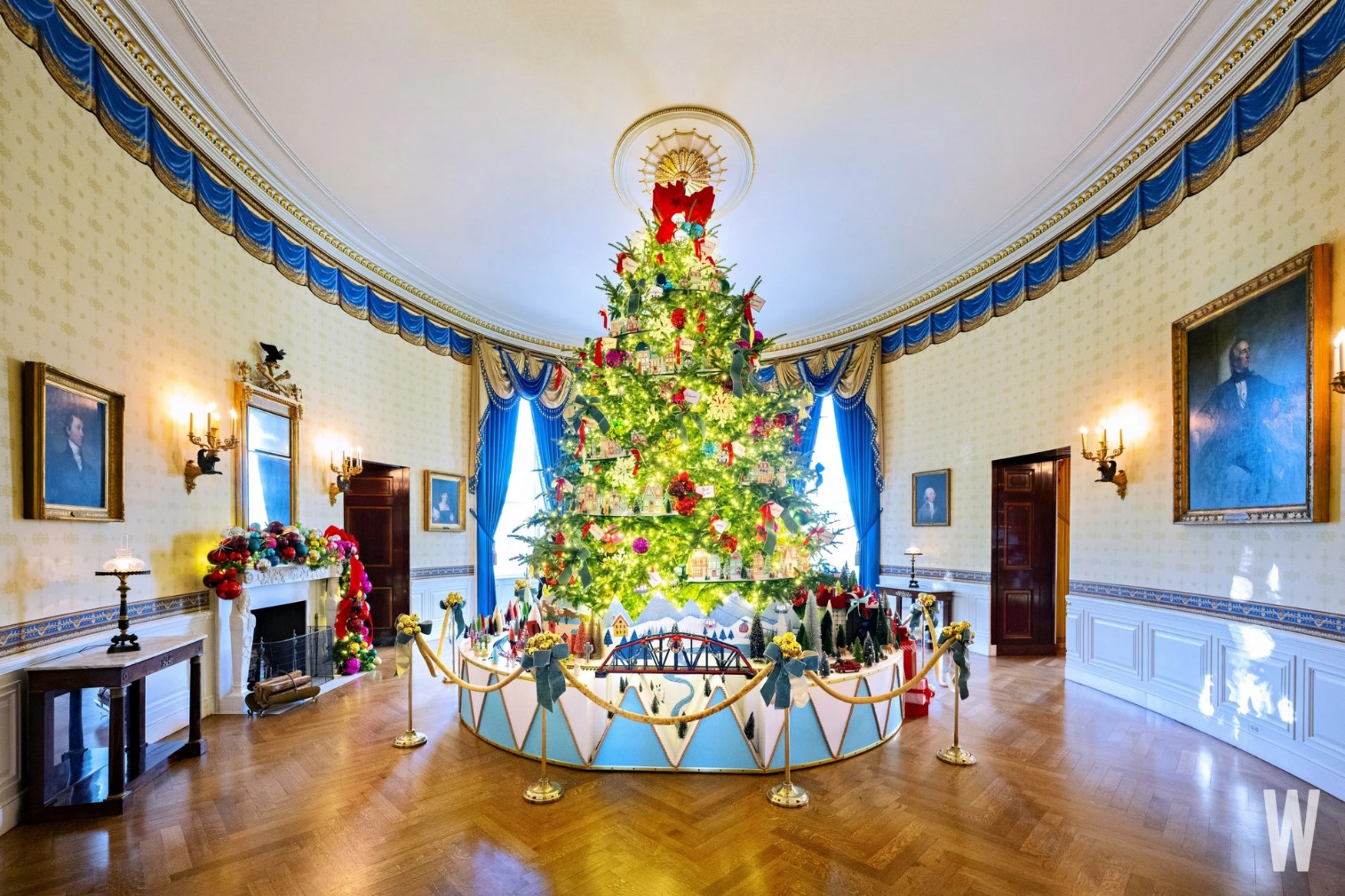 Phòng Xanh lam trưng bày Cây thông Noel chính thức của Nhà Trắng. Cây năm nay đến từ Fleetwood, Bắc Carolina, với cây linh sam Fraser cao 5,6m lên đến gần sát trần căn phòng. |