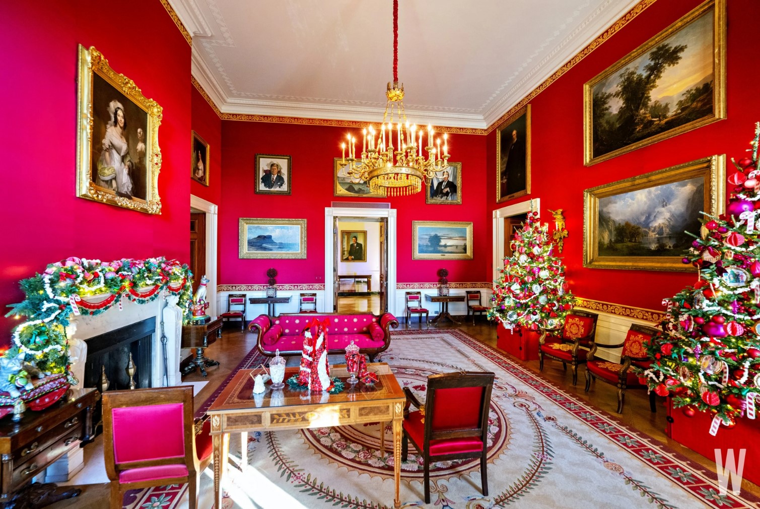 Cây thông Noel và các đồ trang trí thủ công bên trong phòng Đỏ. |
