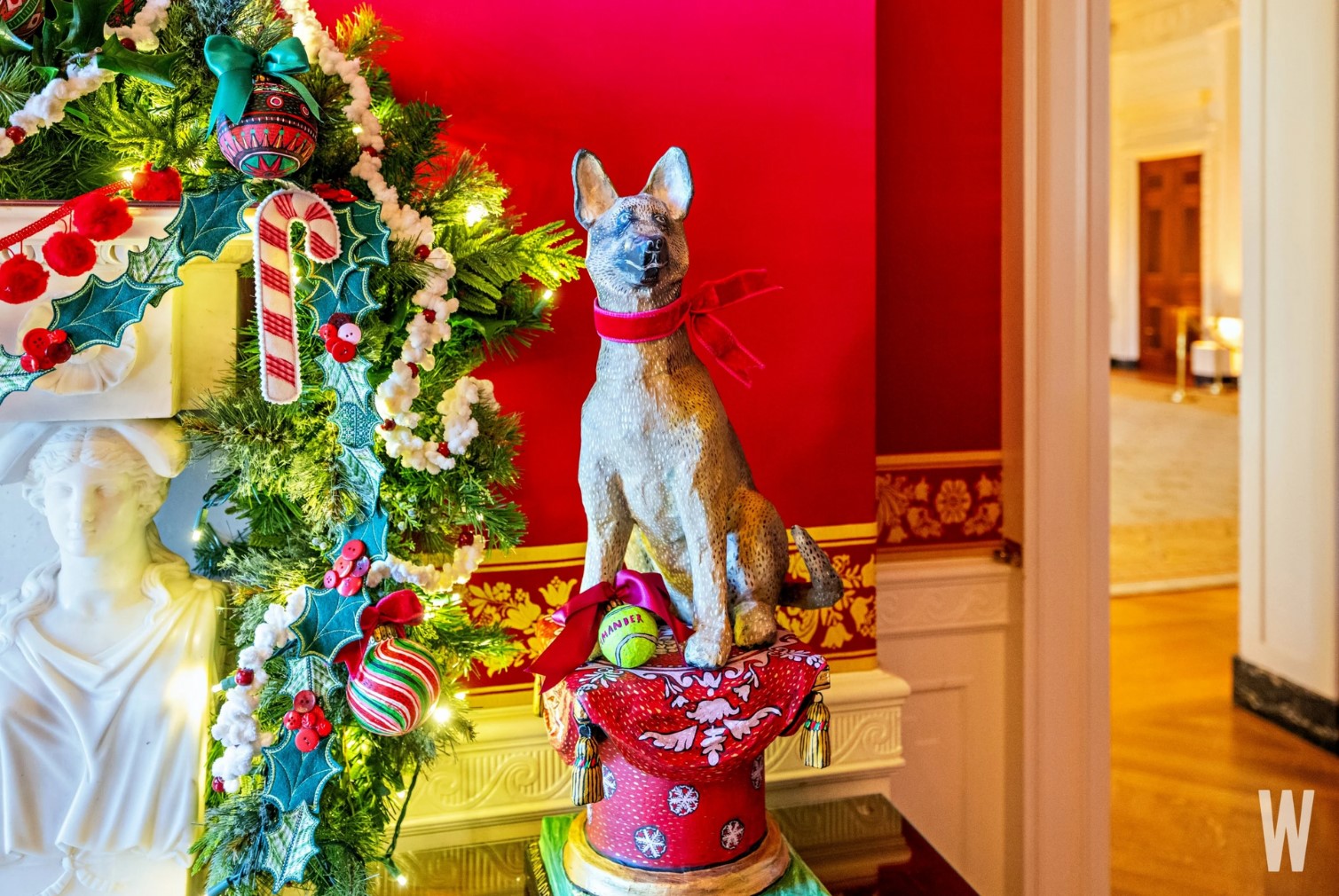 Chú chó chăn cừu Đức của gia đình Biden xuất hiện như một tác phẩm điêu khắc bên trong Phòng Đỏ. |