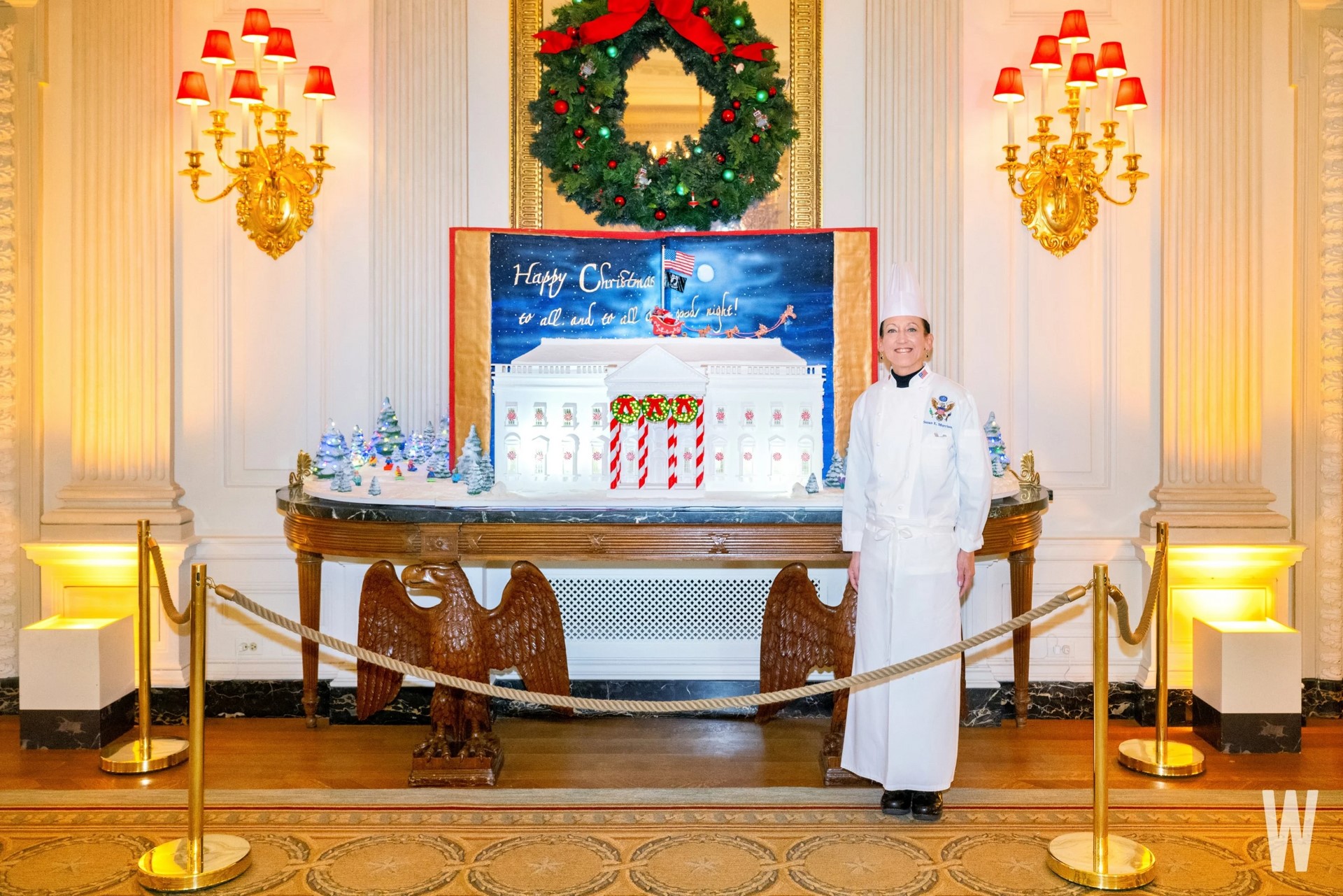 Đầu bếp bánh ngọt của Nhà Trắng Susan Morrison đứng cạnh Bánh gừng Nhà Trắng năm 2023, bao gồm 40 lớp bột bánh quy đường, 40 lớp bột bánh gừng, 40kg bánh ngọt, hơn 13kg sô cô la và 22kg kem phủ. |