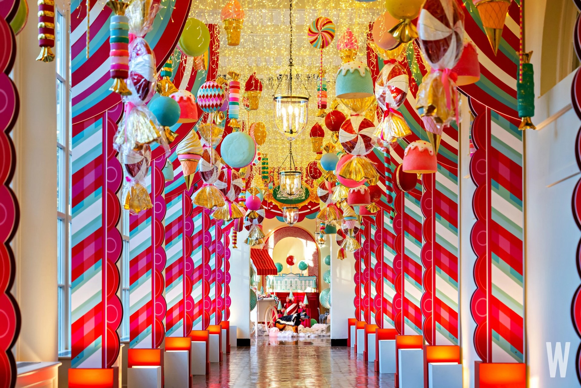 Đồ trang trí hình kẹo và kem treo trên trần dãy cột phía Đông của Nhà Trắng. |