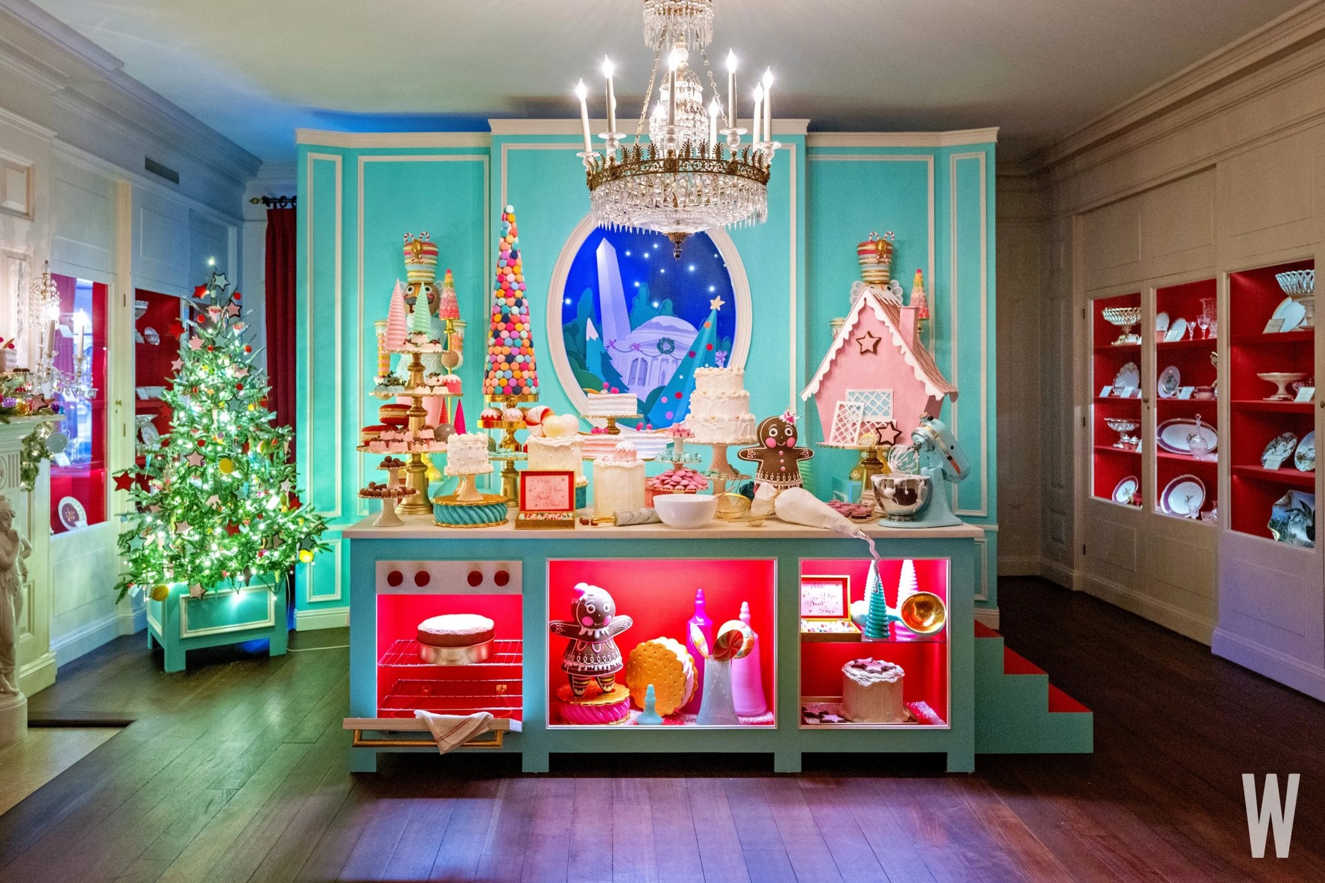 Một cửa hàng đồ ngọt của Nhà Trắng bên trong Phòng Trung Quốc, với dụng cụ nấu nướng và nguyên liệu làm bánh nhằm nhắc nhở khách về những công thức gắn kết các thế hệ gia đình lại với nhau mỗi năm. |