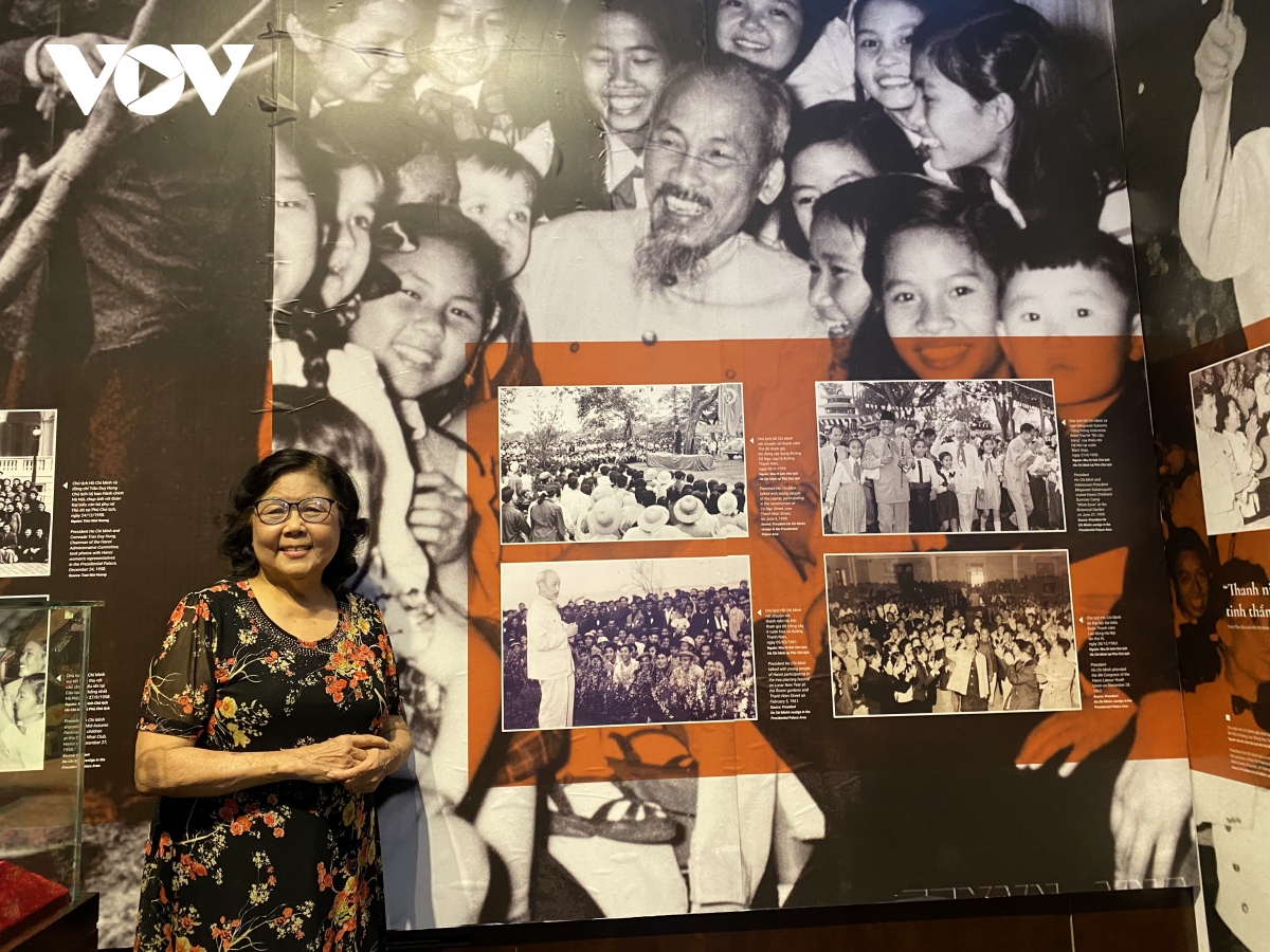 Bà Lê Bích Châu bên bức ảnh Chủ tịch Hồ Chí Minh với các cháu thiếu nhi (có hình bà Lê Bích Châu hồi nhỏ). |
