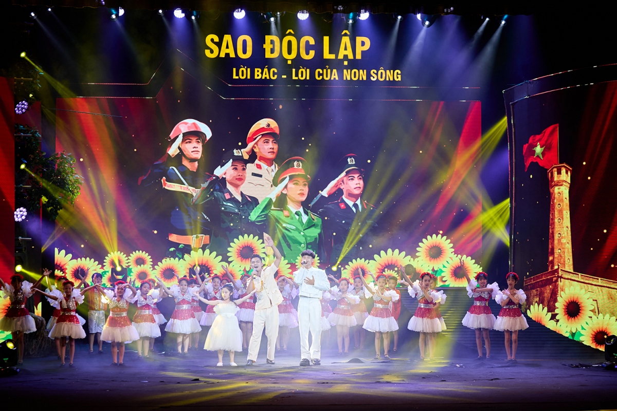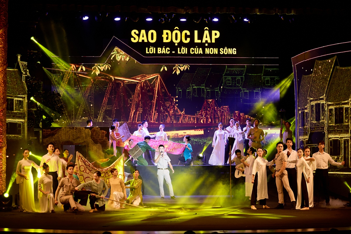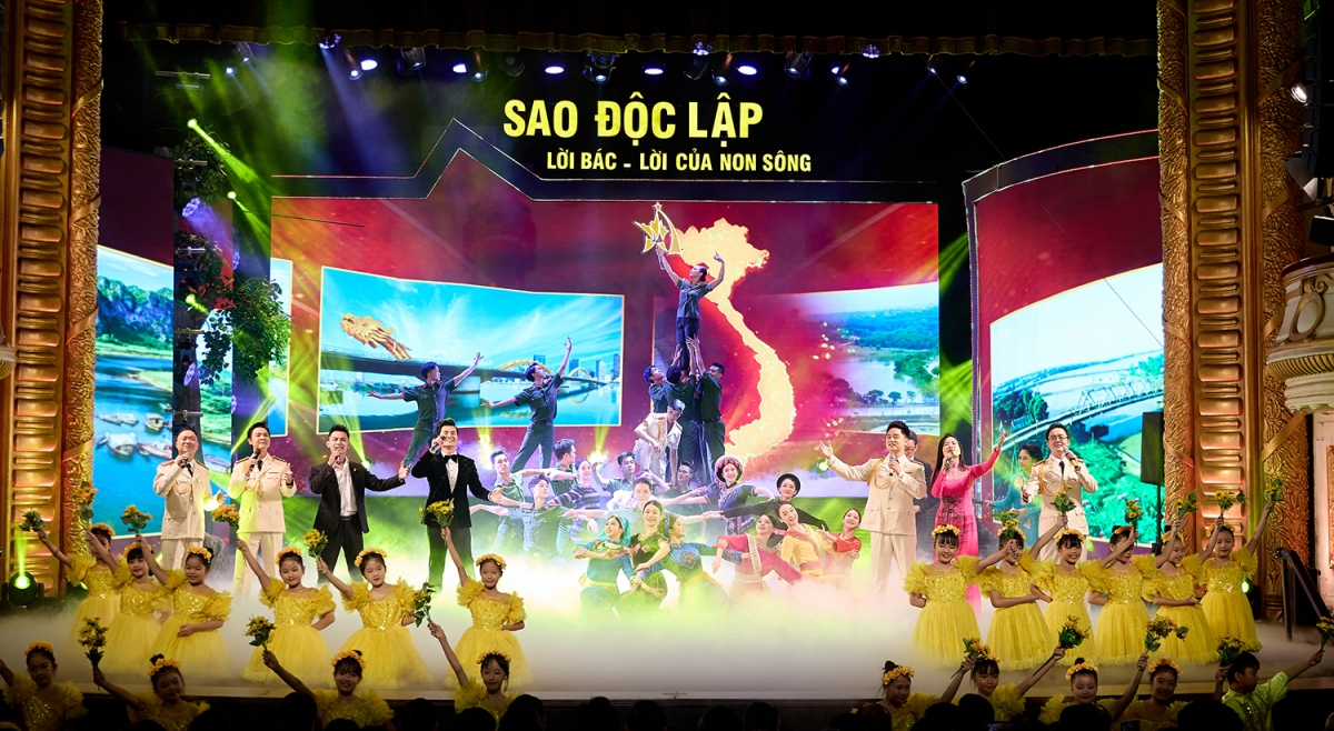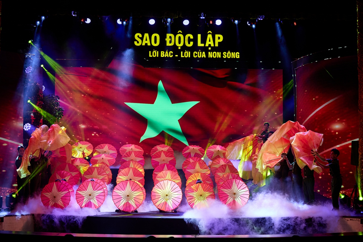| Với thời lượng 80 phút, chương trình “Sao Độc lập” năm 2024 do nghệ sĩ Nguyễn Thị Tuyết Minh tổng đạo diễn và viết kịch bản, là một màn đại nhạc vũ kịch hùng tráng, gồm màn khai từ “Việt Nam rực rỡ những mùa xuân” và 3 chương (Chương I - Tổ quốc gọi tên mình; Chương II - Khúc tráng ca huyền thoại; Chương III - Việt Nam dáng đứng Rồng bay). Ảnh: Minh Khánh |