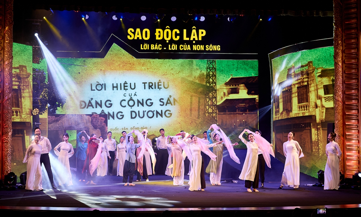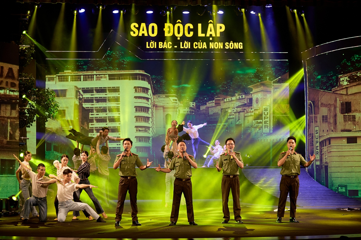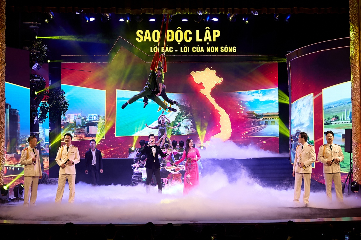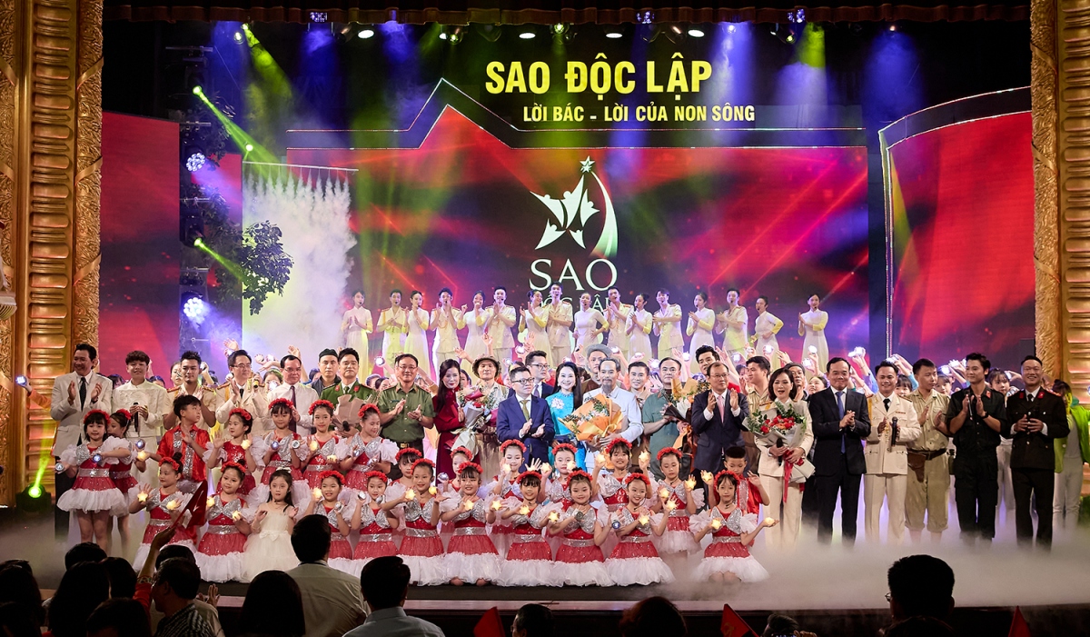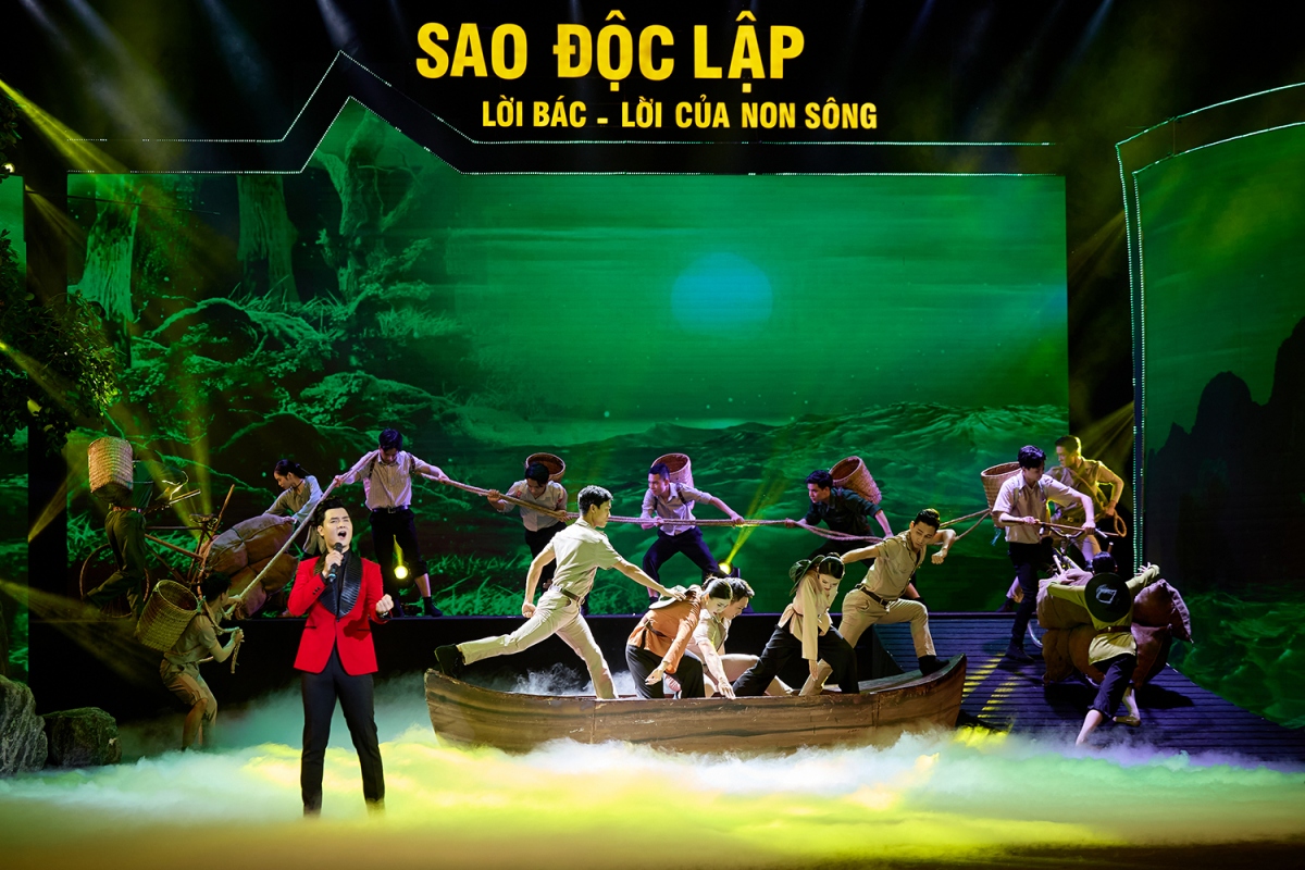 | Với thời lượng 80 phút, chương trình “Sao Độc lập” năm 2024 do nghệ sĩ Nguyễn Thị Tuyết Minh tổng đạo diễn và viết kịch bản, là một màn đại nhạc vũ kịch hùng tráng, gồm màn khai từ “Việt Nam rực rỡ những mùa xuân” và 3 chương (Chương I - Tổ quốc gọi tên mình; Chương II - Khúc tráng ca huyền thoại; Chương III - Việt Nam dáng đứng Rồng bay). Ảnh: Minh Khánh |