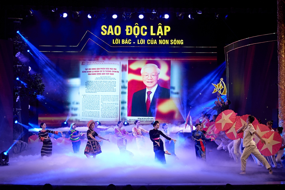 | Trong đó, điểm nhấn của màn khai từ là những tư liệu trích dẫn từ 236 bài viết của cố Tổng Bí Thư Nguyễn Phú Trọng in trên Tạp chí Cộng sản và được lan toả khắp mọi miền Tổ quốc. Những dòng chữ từ trái tim nhân văn, tư tưởng của bậc hiền nhân truyền lại khát vọng độc lập, tự do, hạnh phúc trường tồn cho nhân dân và cho đất nước Việt Nam. Ảnh: Minh Khánh |