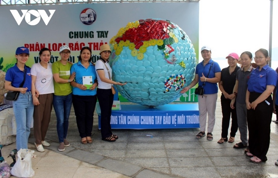 Rác thải nhựa được tái chế sử dụng làm quả địa cầu. Ảnh: Đình Thiệu/VOV |