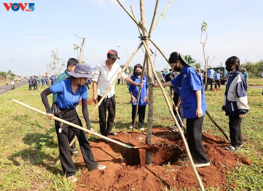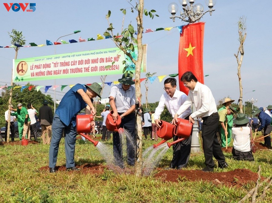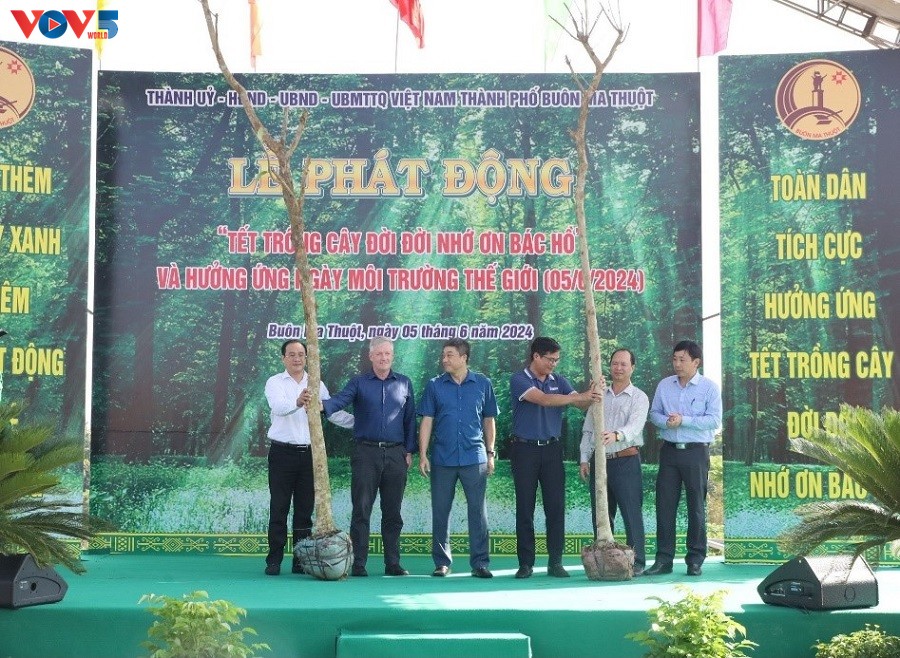 Sáng 5/6, tại TP. Buôn Ma Thuột, UBND TP. Buôn Ma Thuột, tỉnh Đắk Lắk đã tổ chức Lễ phát động “Tết trồng cây đời đời nhớ ơn Bác Hồ” và hưởng ứng Ngày Môi trường thế giới năm 2024. Ảnh: Nam Trang/VOV |