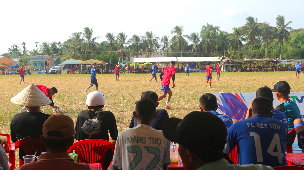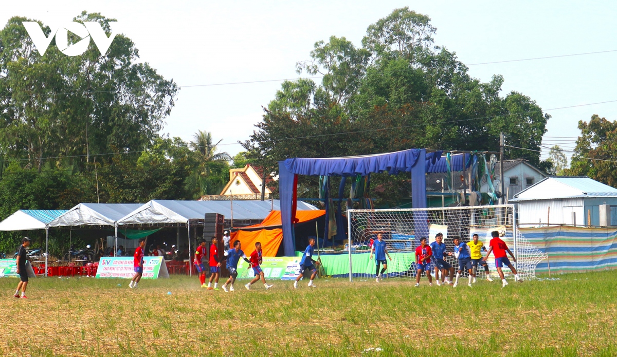 Giải bóng đá trên mặt sân ruộng, ngay trước cổng chùa Prek Ping Taung đã góp thêm sinh khí tưng bừng để đồng bào đón mừng năm mới. |