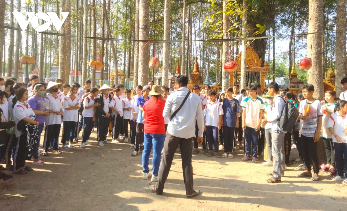 Các em học sinh trường THCS Dân tộc nội trú huyện Châu Thành nô nức tham gia trò chơi dân gian trong khuôn viên chùa nhân dịp Tết cổ truyền Chôl Chnăm Thmây. |