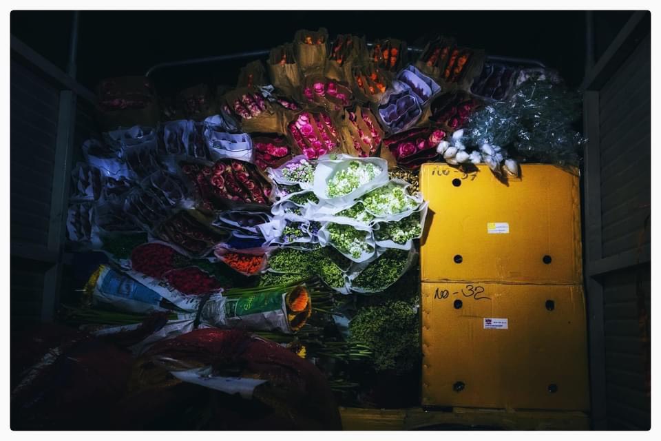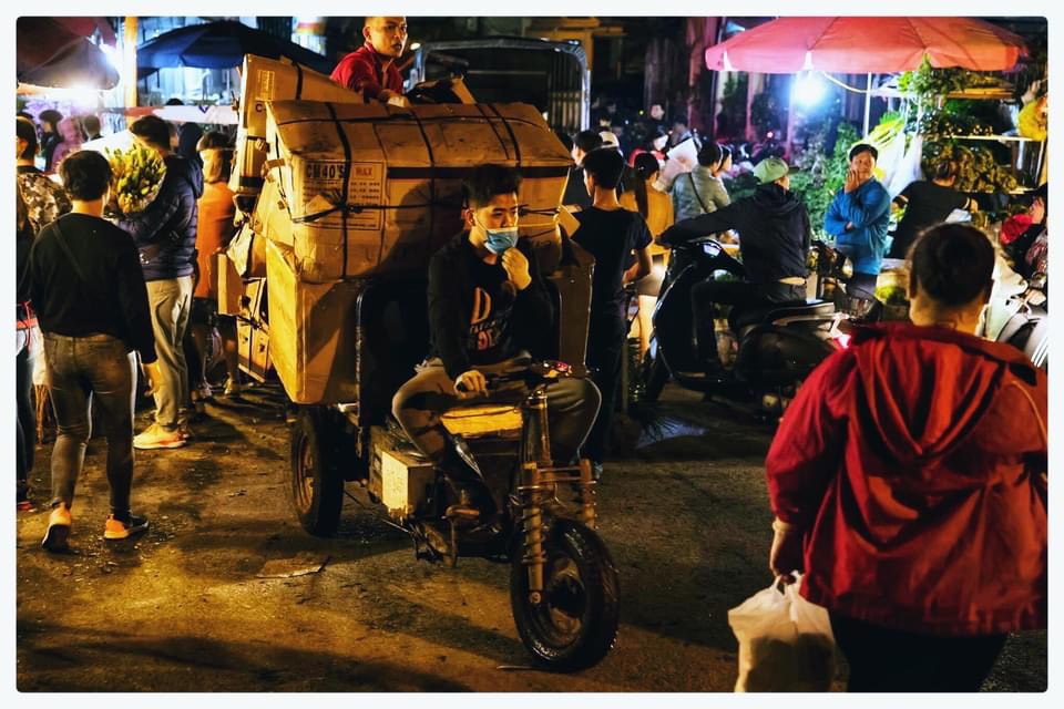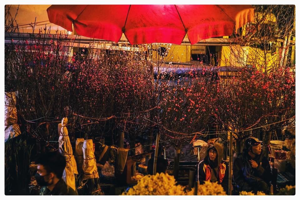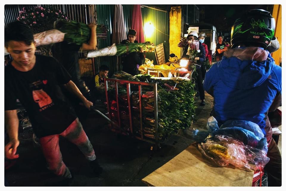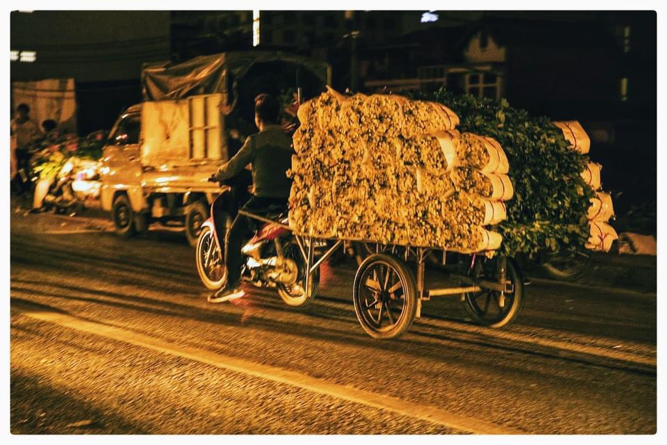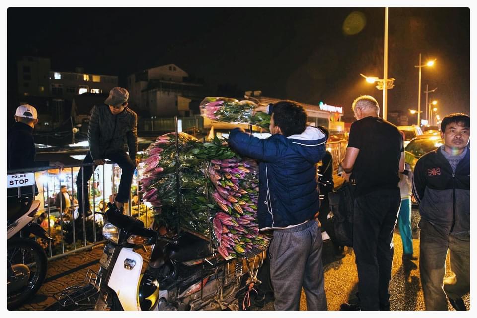 | Tiểu thương hối hả ngược xuôi. Khi cả thành phố say giấc, nơi góc phố này chỉ còn ánh đèn vàng từng sạp hoa. |