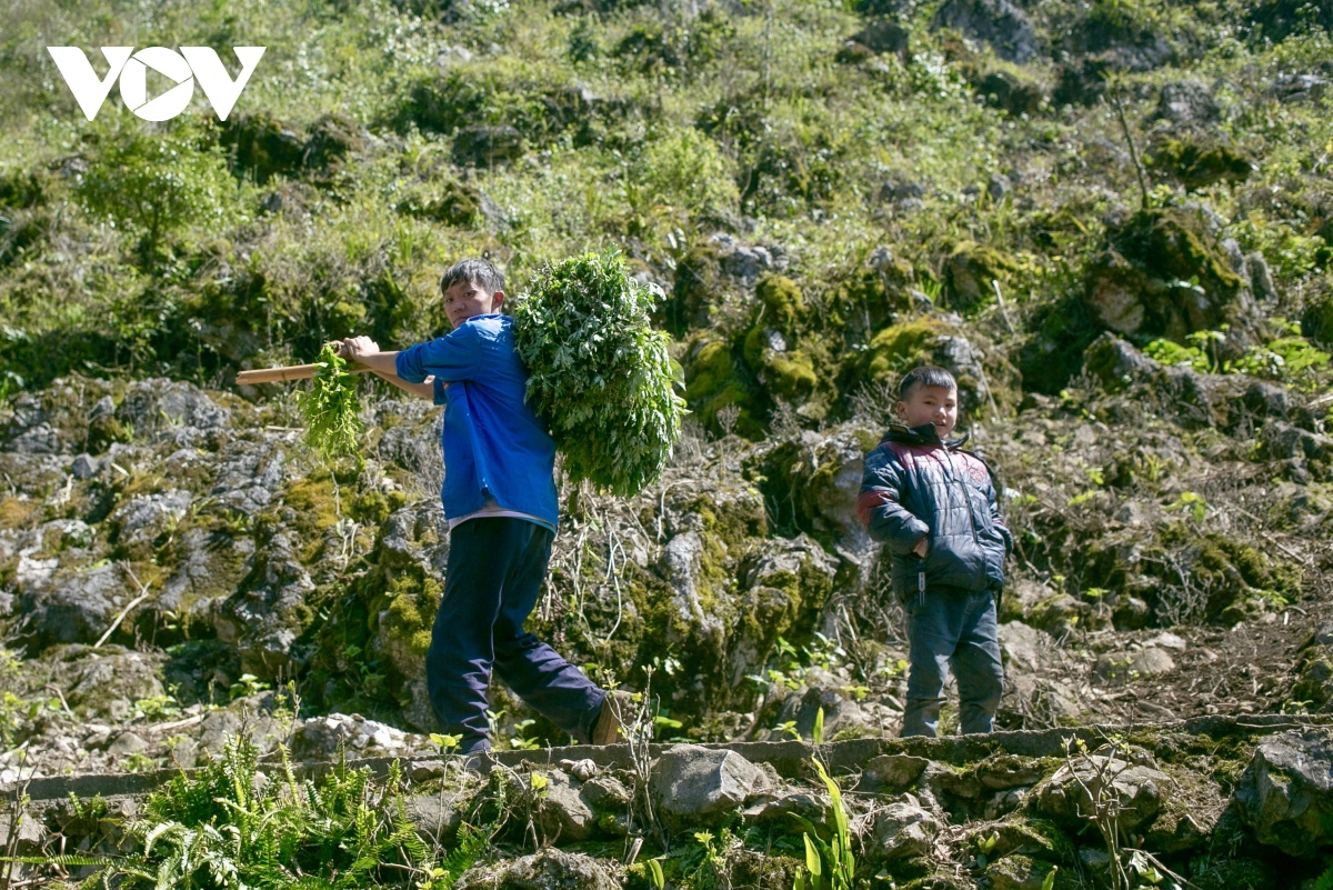 Sống trên vùng núi đá, bà con tận dụng những hốc đất nằm trong khe đá để trồng ngô. Đây là cây lương thực chính của người dân nơi đây.