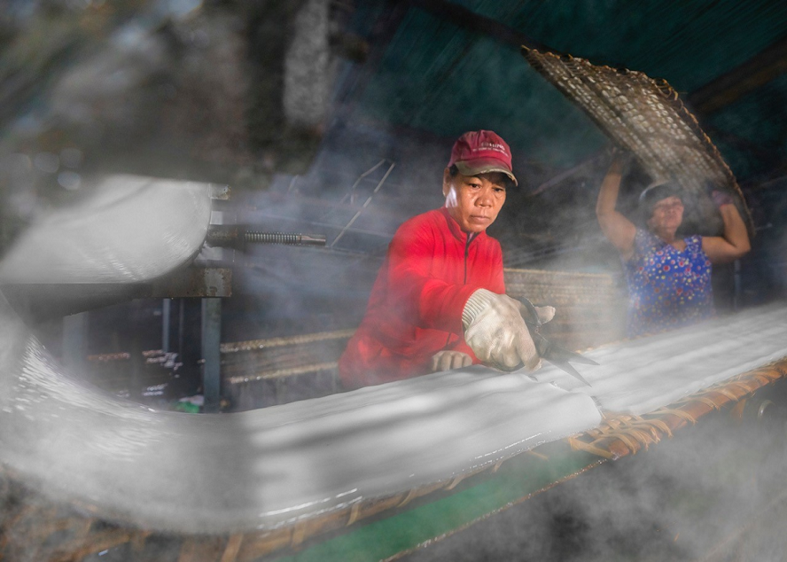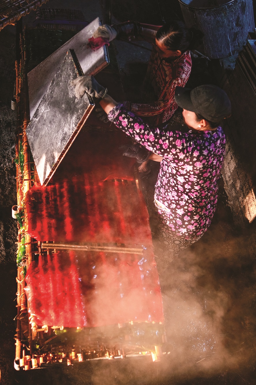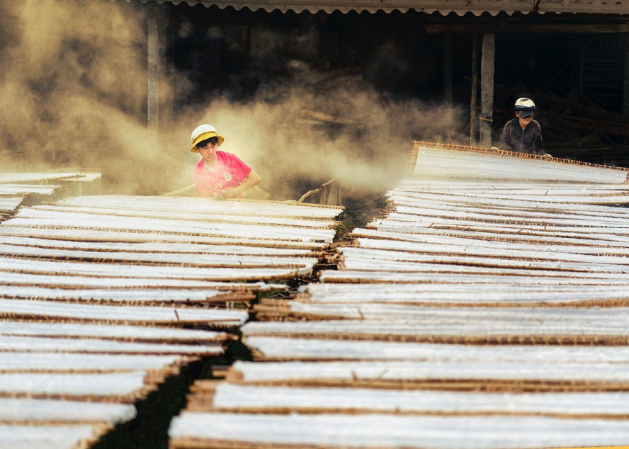 Những mẻ bột khoai bốc khói từ chiếc máy hấp, sau đó được đặt ở giàn tre rồi đem phơi. Ảnh: NAG Huỳnh Thanh Liêm |