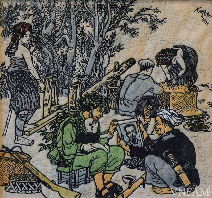 Thổ, Nùng, Mán, Kinh đoàn kết đuổi giặc Pháp - Tranh khắc gỗ của họa sĩ Trần Văn Cẩn sáng tác khoảng từ 1947-1954. |