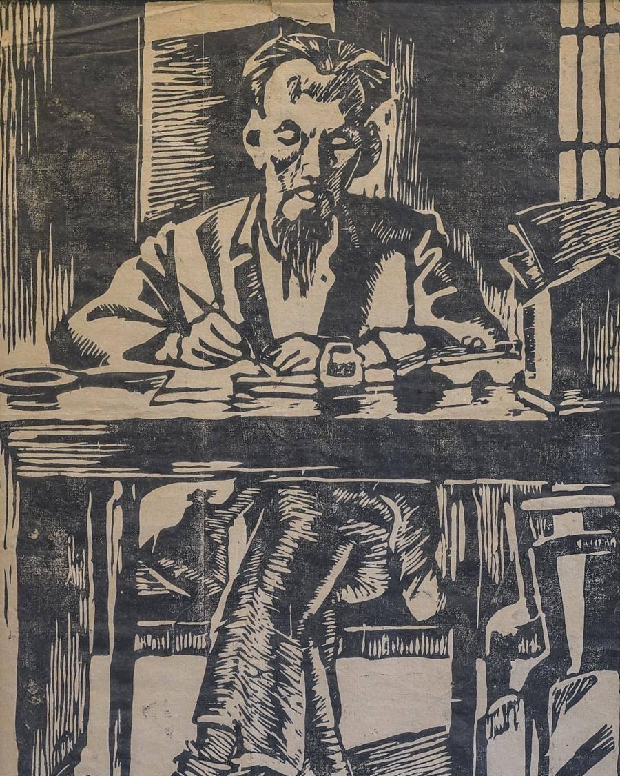 Hồ Chủ tịch làm việc ở Bắc Bộ phủ. Tác giả: Tô Ngọc Vân. Chất liệu: Khắc gỗ. Thời gian sáng tác: 1946. |