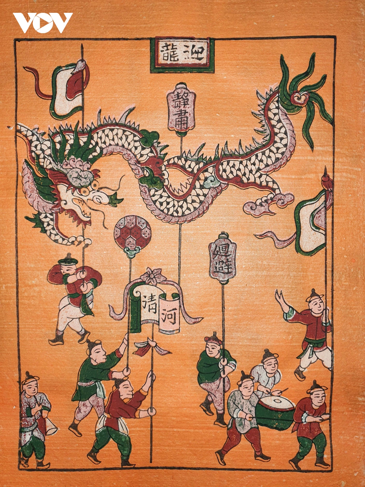Tranh Rước rồng: Con Rồng đã trở thành linh vật của người dân Việt, gắn liền với tâm thức về “Con Rồng Cháu Tiên”. Con Rồng cũng là biểu tượng và biểu thị cho cả quyền uy của tự nhiên cũng như trong xã hội. Múa Rồng là một trò trình diễn kết hợp tài khéo léo và sức mạnh. |