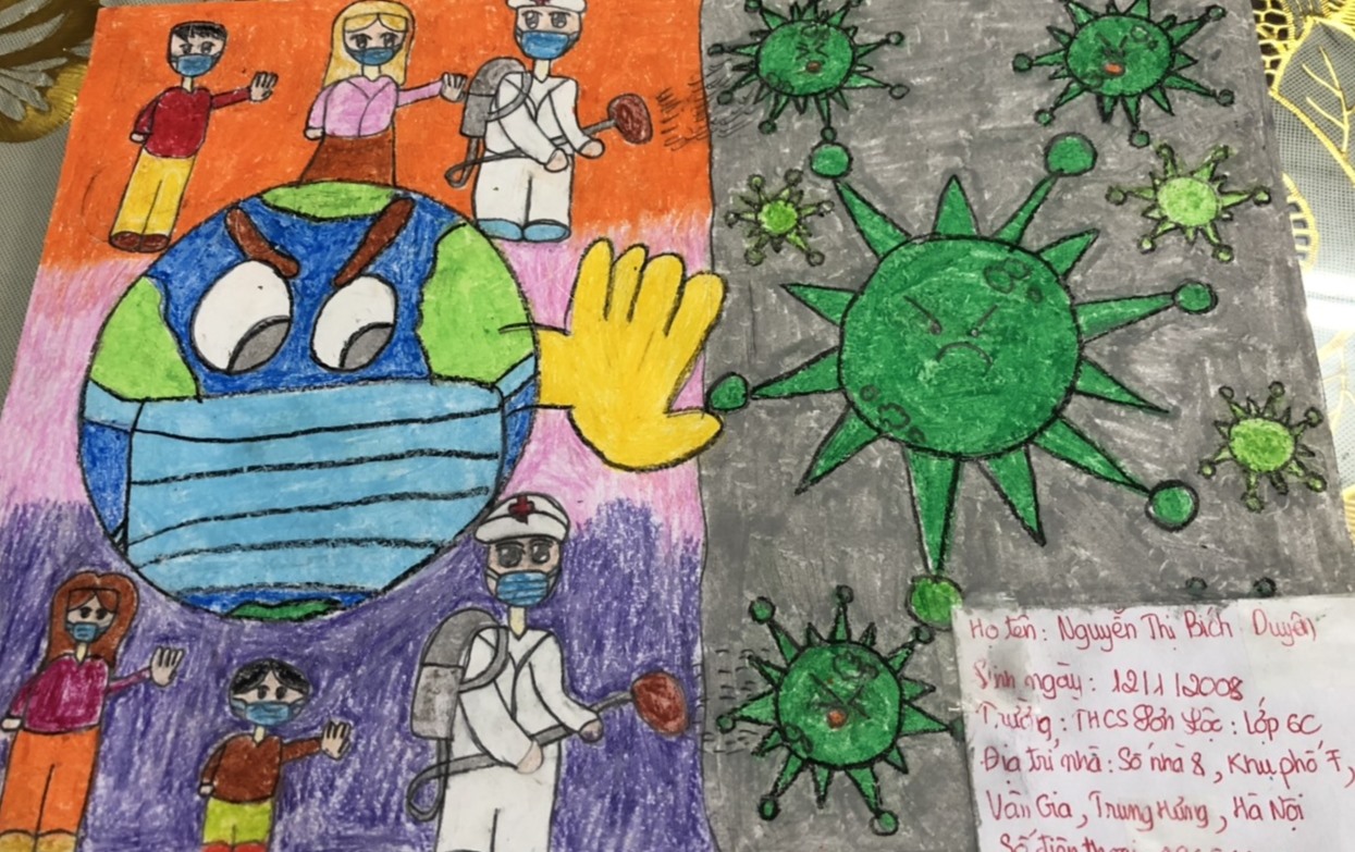 Tác phẩm “Chung tay đẩy lùi virus SARS-CoV-2” của em Nguyễn Thị Bích Duyên, trường THCS Sơn Lộc, Sơn Tây, Hà Nội. |