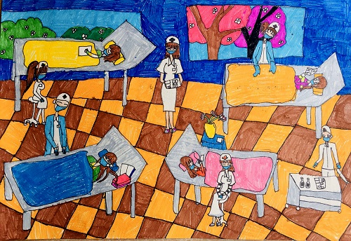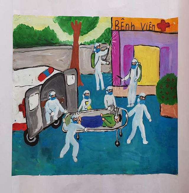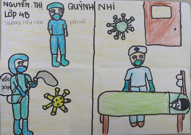 “Đánh giặc corona – Ngành y là xung kích” – tranh vẽ của học sinh Trường tiểu học Bắc Hồng, Hồng Lĩnh, Hà Tĩnh. |