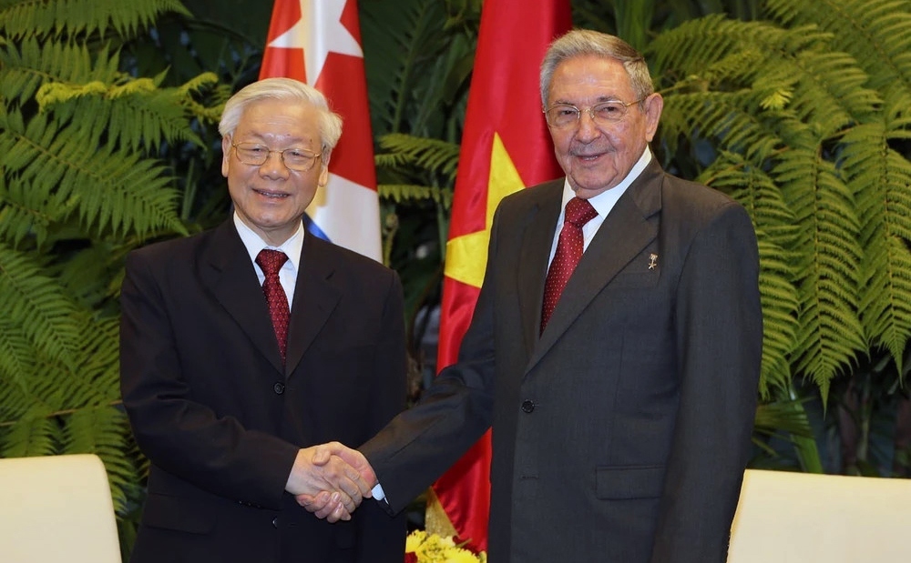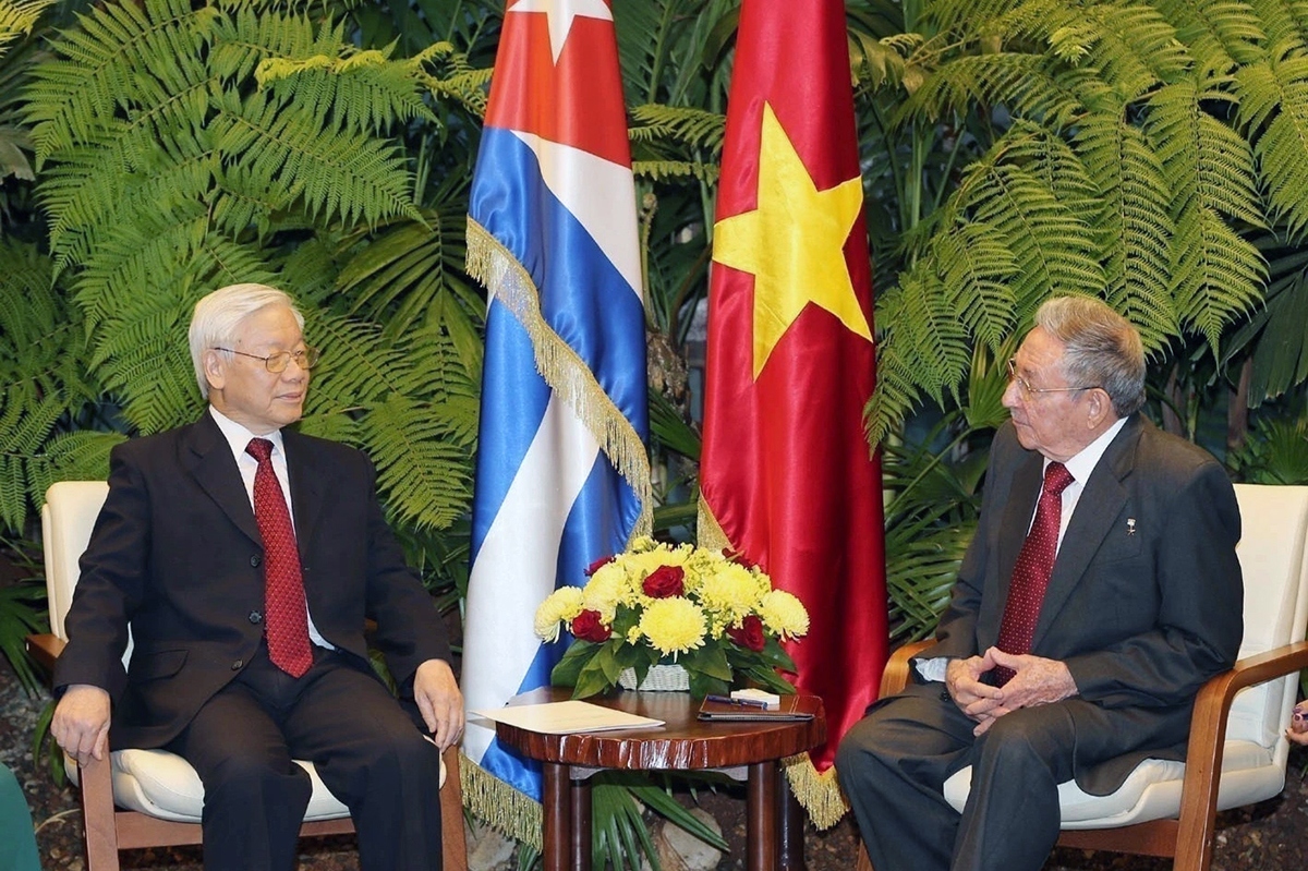 Đồng chí Raul Castro Ruz, Bí thư Thứ nhất Ban Chấp hành Trung ương Đảng Cộng sản Cuba, Chủ tịch Hội đồng Nhà nước và Hội đồng Bộ trưởng Cộng hòa Cuba đón và hội đàm với Tổng Bí thư Nguyễn Phú Trọng chiều 29/3/2018, tại Cung Cách mạng ở Thủ đô La Habana. Ảnh: Trí Dũng/TTXVN