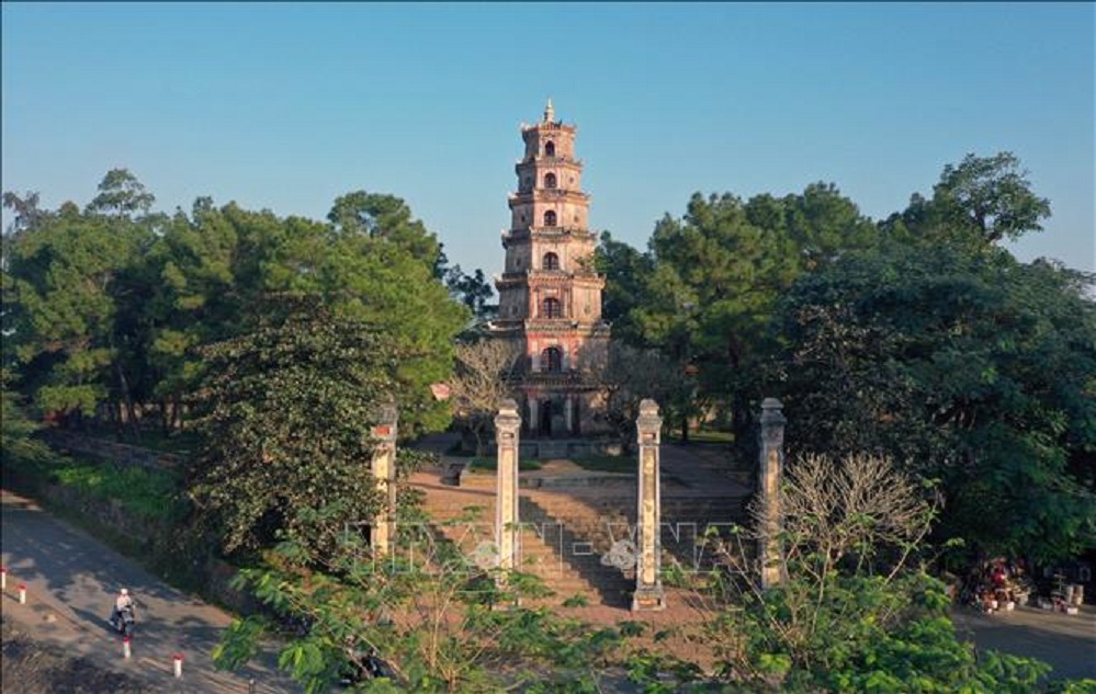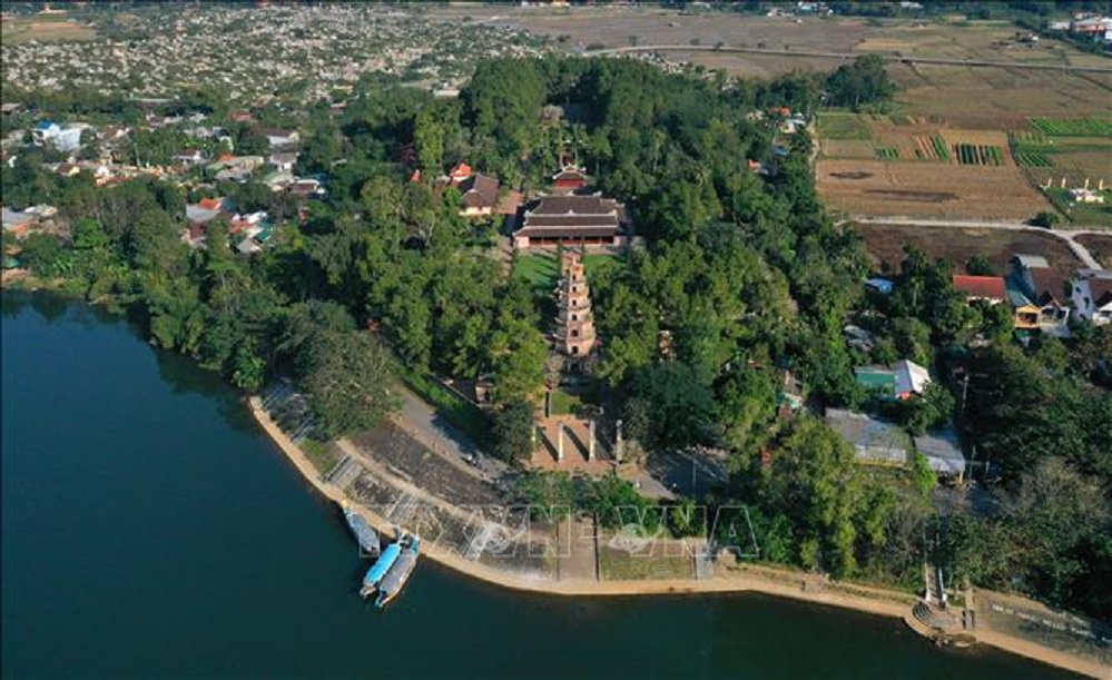 Nhìn từ trên cao, tổng thể ngôi chùa như hình con rùa khổng lồ nằm soi bóng xuống dòng sông Hương. Ảnh: TTXVN