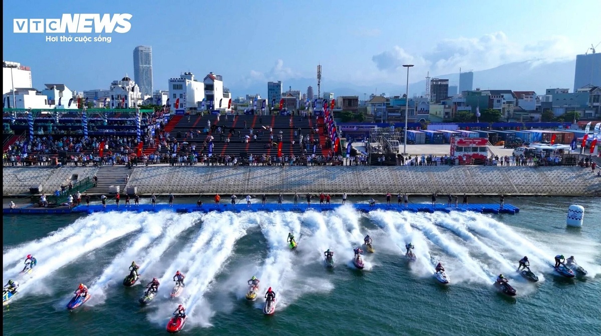55 tay đua mô tô nước hàng đầu thế giới đến từ 26 quốc gia trên thế giới đã chính thức bước vào màn 'rượt đuổi' tốc độ cao đầu tiên tại Giải đua mô tô nước quốc tế UIM-ABP Aquabike. Ảnh: Thanh Thắng/VOV |