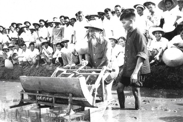 Chủ tịch Hồ Chí Minh ra đồng gặt lúa cùng nông dân.