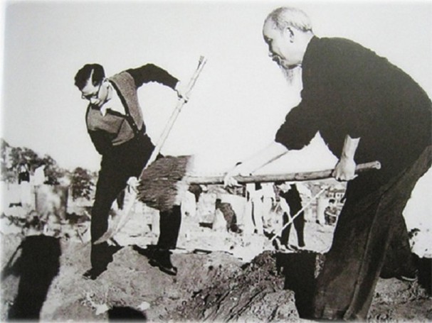 Chủ tịch Hồ Chí Minh cùng bác sĩ Trần Duy Hưng tham gia lao động tại Công viên Thống Nhất.