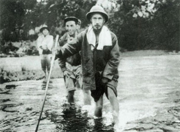 Chủ tịch Hồ Chí Minh lội suối lên thăm các chiến sỹ ở Việt Bắc.