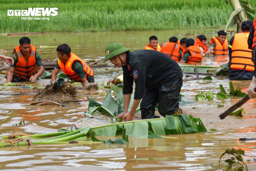 Lực lượng quân đội, công an ngâm mình trong nước lũ hỗ trợ người dân TP. Thái Nguyên. Ảnh: Lam Trang/VOV |