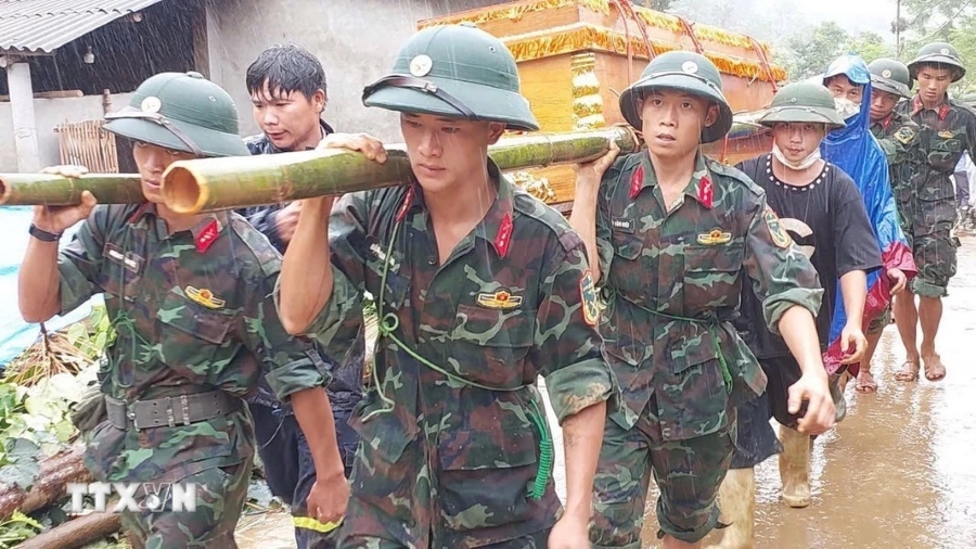 Bộ đội đưa linh cữu nạn nhân để gia đình mai táng trong cơn mưa tầm tã. Ảnh: TTXVN |