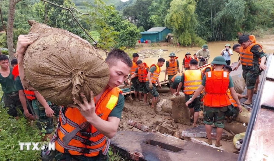 Lực lượng bộ đội gia cố những vị trí xung yếu đề phòng lũ quét tiếp tục xảy ra ở thôn Làng Nủ. Ảnh: TTXVN |
