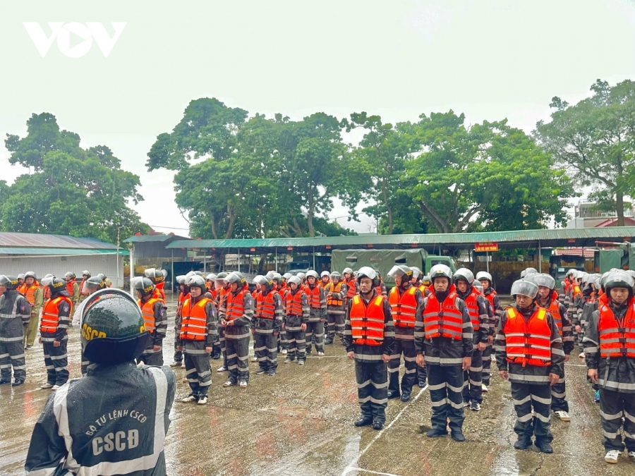 Các chiến sĩ Bộ Tư lệnh Cảnh sát Cơ động ra quân với tinh thần cao nhất, nhằm bảo vệ an toàn tính mạng và tài sản cho người dân trong bão Yagi. Ảnh: VOV |