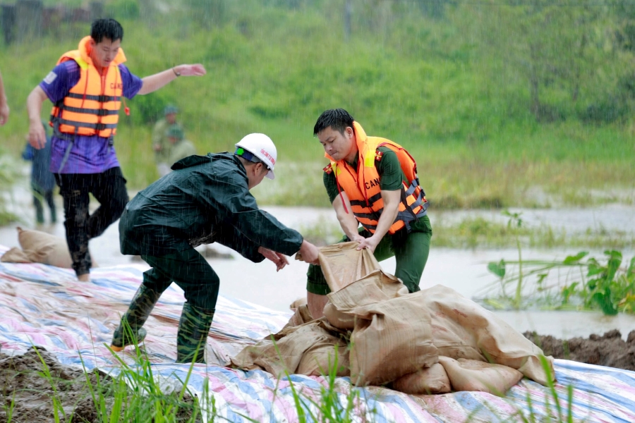 Công an thị xã Đông Triều (tỉnh Quảng Ninh) huy động toàn bộ lực lượng cùng người dân dầm mưa đắp đê Hồng Phong ngăn lũ. Ảnh: Ngọc Anh/daidoanket.vn |