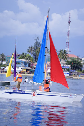 | Các vận động viên thi đấu với loại thuyền buồm hai thân Catamaran bằng vật liệu PPC do Công ty CP công nghệ Việt-Séc tự nghiên cứu chế tạo. |