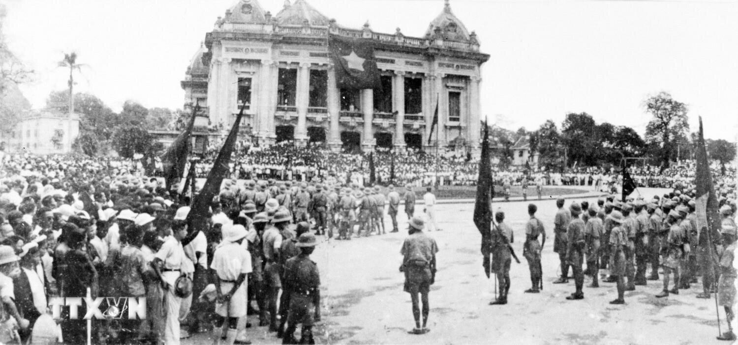 | Sáng 19/8/1945, đồng bào tập trung kéo đến quảng trường Nhà hát Lớn Hà Nội dự cuộc mít tinh lớn do Mặt trận Việt Minh tổ chức. Đại biểu Việt Minh đọc tuyên ngôn, chương trình của Việt Minh và kêu gọi Nhân dân đứng dậy giành chính quyền. Ảnh: Tư liệu/TTXVN |