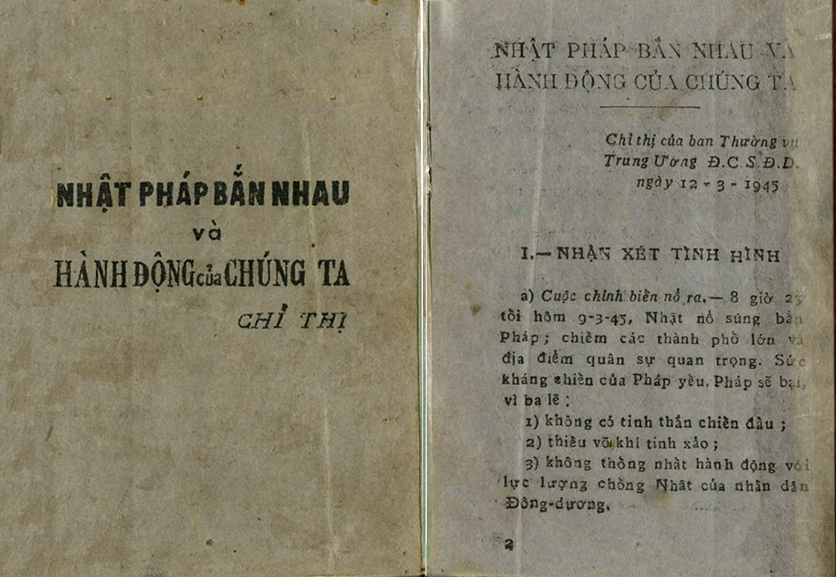 | Ngày 09/3/1945, Nhật đảo chính Pháp, độc chiếm Ðông Dương. Ngày 12/3/1945, Ban Thường vụ Trung ương Ðảng tổ chức hội nghị mở rộng ở Ðình Bảng (Bắc Ninh) kịp thời ra chỉ thị: Nhật - Pháp bắn nhau và hành động của chúng ta. |