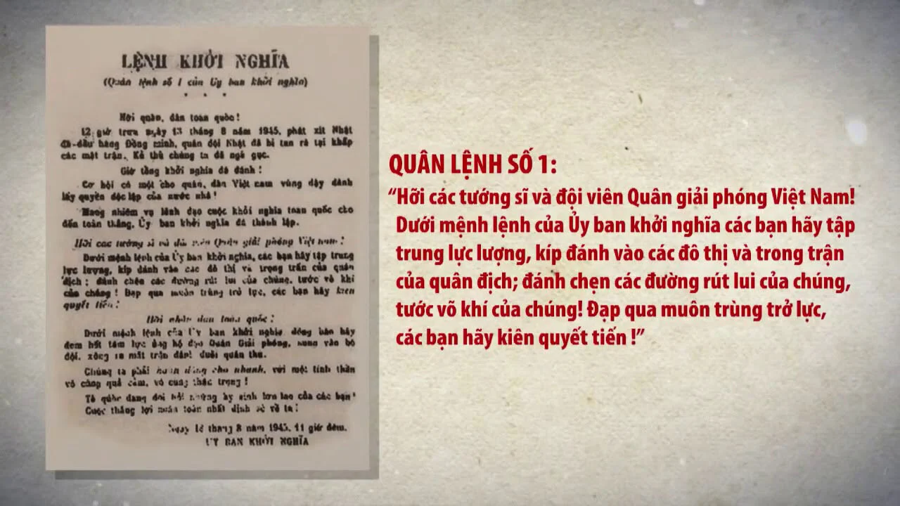 | 23h ngày 13/8/1945, Ủy ban Khởi nghĩa ra Quân lệnh số 1 hiệu triệu toàn dân tổng khởi nghĩa. Ngày 16/8/1945, Đại hội Quốc dân họp tại Tân Trào thông qua "10 chính sách lớn của Việt Minh"; thông qua "Lệnh Tổng khởi nghĩa"; quy định quốc kỳ, quốc ca; thành lập Ủy ban Dân tộc giải phóng Trung ương, tức Chính phủ lâm thời với sự lãnh đạo của Chủ tịch Hồ Chí Minh. Ảnh: Truyền hình Nhân Dân. |