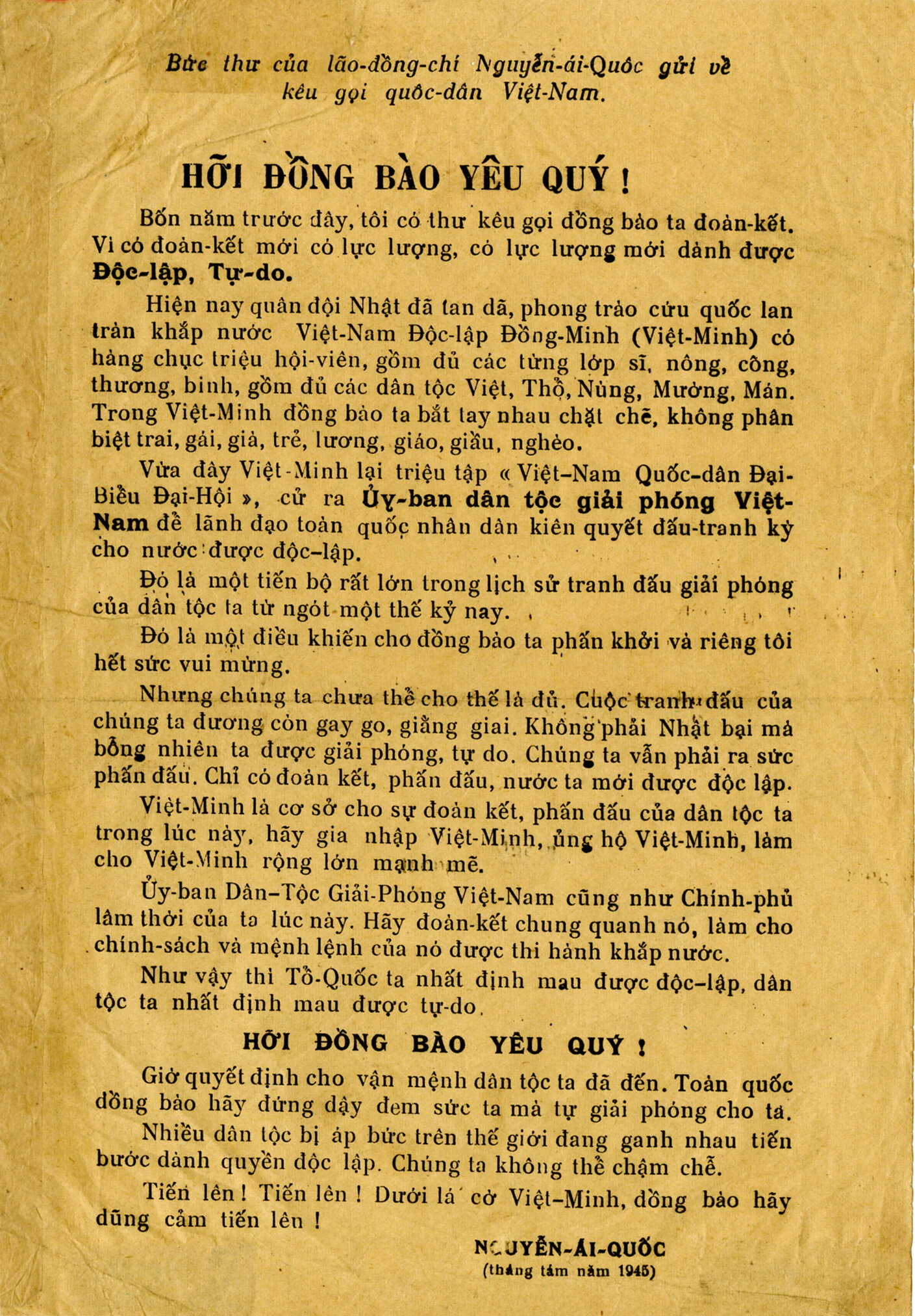 | Sau Đại hội Quốc dân, Chủ tịch Hồ Chí Minh gửi thư kêu gọi đồng bào gia nhập Việt Minh, ủng hộ Việt Minh và Uỷ ban Dân tộc Giải phóng Việt Nam đánh đuổi Nhật - Pháp giành độc lập cho Tổ quốc. Ảnh: Bảo tàng Lịch sử Quốc gia |