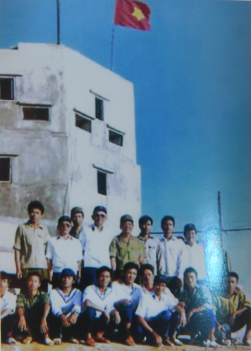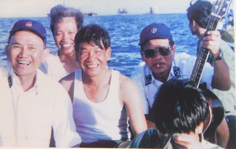 Năm 1993, Thượng tướng Lê Khả Phiêu (áo xanh đứng giữa) thăm các chiến sĩ ở đảo Đá Tây - Trường Sa. |