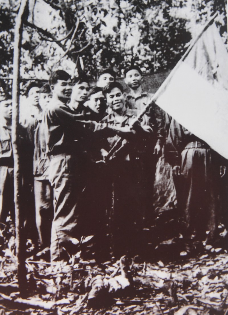| Ảnh chụp năm 1968: Chính ủy Trung đoàn 9 - Lê Khả Phiêu trao cờ quyết thắng cho Tiểu đoàn trưởng Tiểu đoàn 2, trước giờ nổ súng tiến công vào thành phố Huế trong cuộc Tổng tiến công nổi dậy mùa xuân năm 1968. |