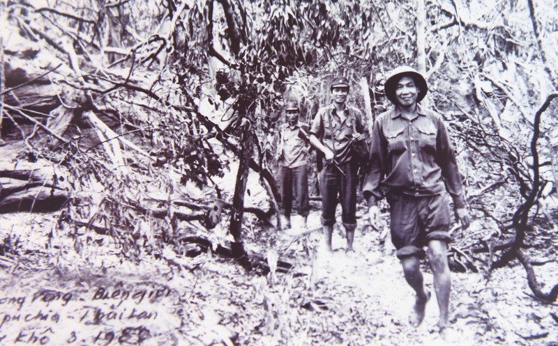 Năm 1986, Thiếu tướng Lê Khả Phiêu và các cán bộ cơ quan chính trị Bộ Tư lệnh Quân tình nguyện Việt Nam tại Campuchia đi công tác, nắm địa hình vùng núi phía bắc Campuchia. |