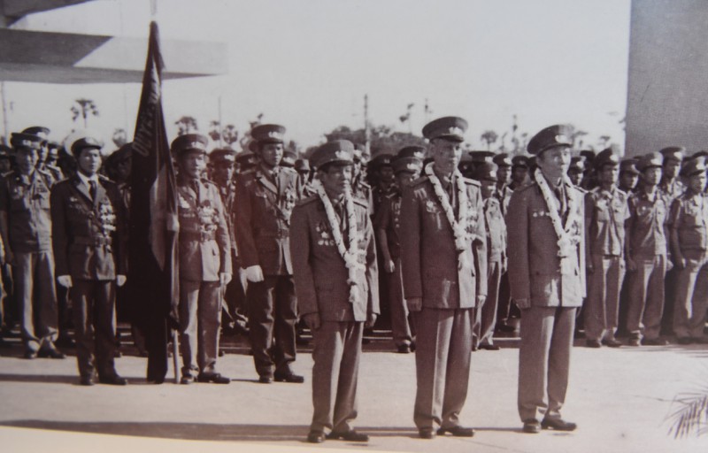 Bức ảnh chụp vào tháng 12 năm 1988. Trung tướng Lê Khả Phiêu (hàng đầu, thứ nhất từ trái sang) trong đội hình Bộ Tư lệnh Quân Việt Nam trở về nước tại sân bay Pô Chen Tông, Phnom Penh. |