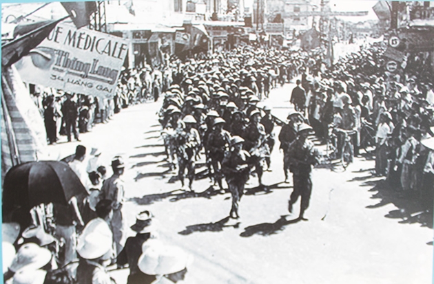 Các chiến sĩ bộ binh của Trung đoàn Thủ đô tiến về tiếp quản Thủ đô, sáng 10/10/1954. Nguồn: TTXVN |
