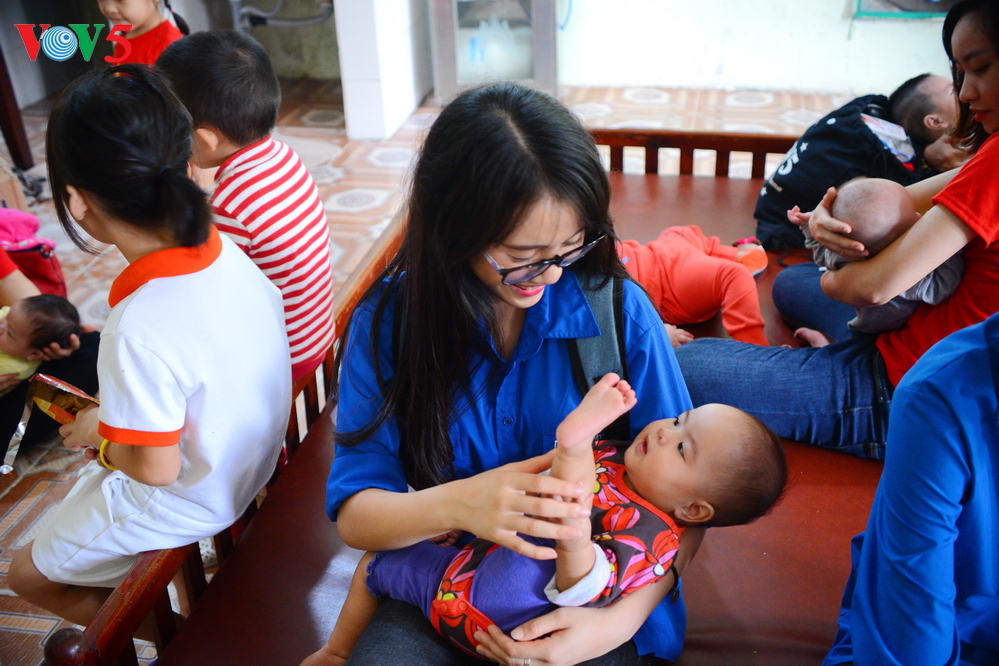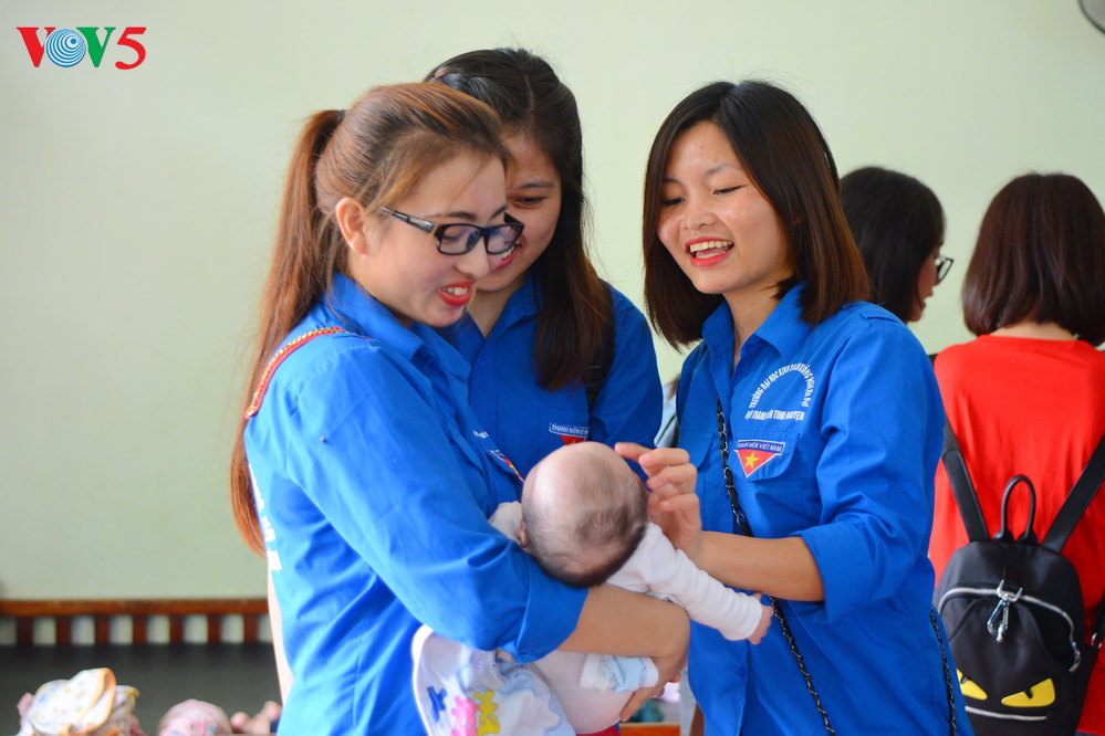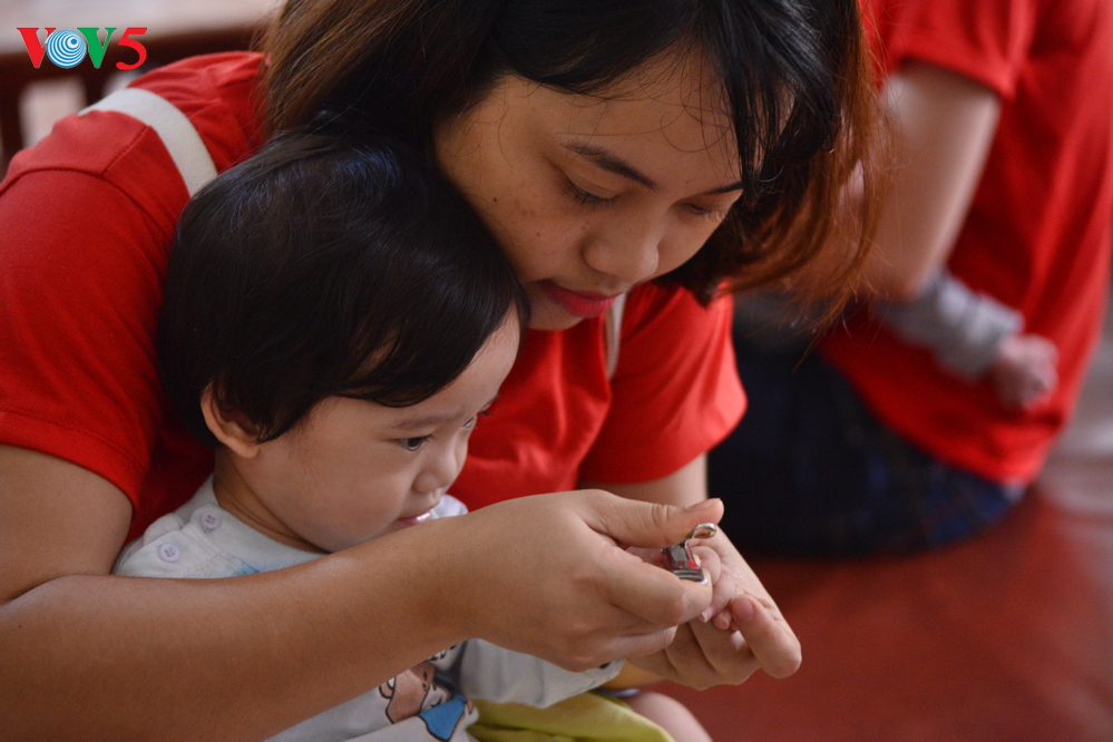 | Tại khu chăm sóc trẻ sơ sinh, các thành viên trong đoàn đã cùng giúp hộ lý của trung tâm tiến hành thay tã, cho các em ăn sữa, chơi đùa với các em. |
