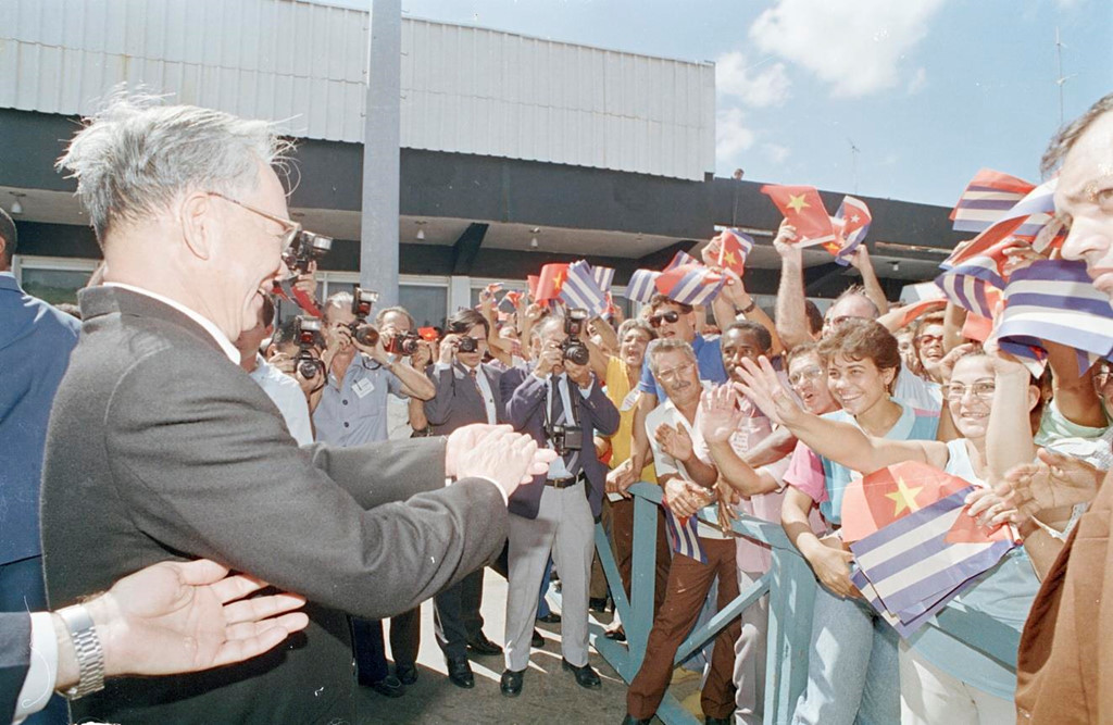 Ngày 7/5/1988, tại quần đảo Trường Sa, Đại tướng Lê Đức Anh, Bộ trưởng Bộ Quốc phòng, dự lễ kỷ niệm 33 năm ngày truyền thống của Quân chủng Hải quân Việt Nam (7.5.1955 - 7.5.1988). Bên cột mốc chủ quyền, Đại tướng nhấn mạnh lời thề Quyết tâm bảo vệ bằng được Tổ quốc thân yêu, bảo vệ bằng được quần đảo Trường Sa - một phần lãnh thổ và lãnh hải thiêng liêng của Tổ quốc. |