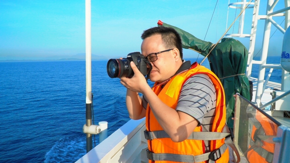 Phóng viên VOV miền Trung trong một lần tác nghiệp trên biển. |
