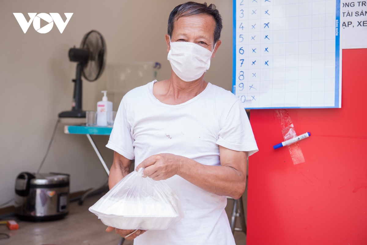 Do giãn cách xã hội không tập trung đông người nên mỗi ngày cứ vào khoảng 10h, chú Tuân lại mang những suất cơm vận chuyển đến từng khu vực định sẵn.