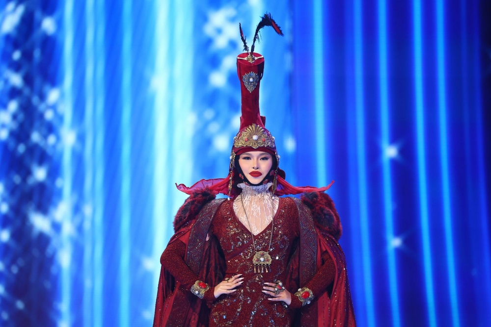 Hoa hậu Mông Cổ xuất hiện với trang phục có phần mũ khá lớn. Đây có thể là sự khát vọng lớn được gửi gắm trong bộ trang phục này.