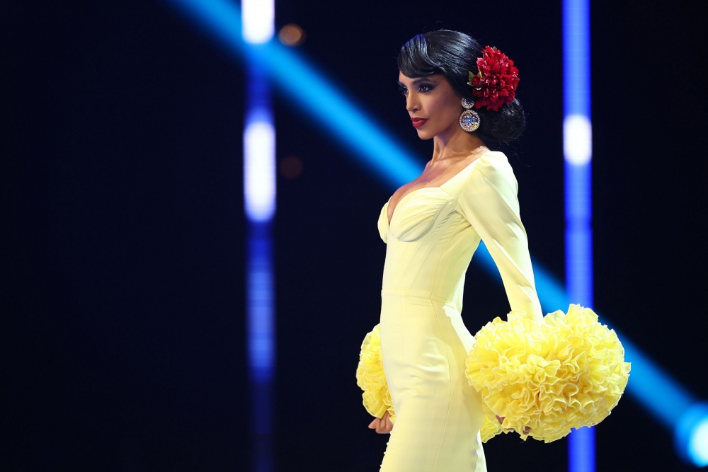 Chiếc váy của hoa hậu Tây Ban Nha được lấy cảm hứng từ chính nền văn hóa nghệ thuật flamenco ở quê nhà. Chiếc váy nổi bật với cổ tay được xếp ly, giống hoa cẩm chướng.